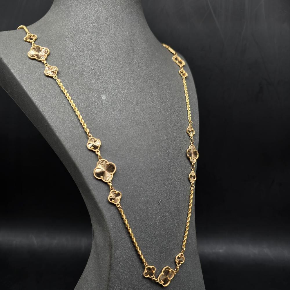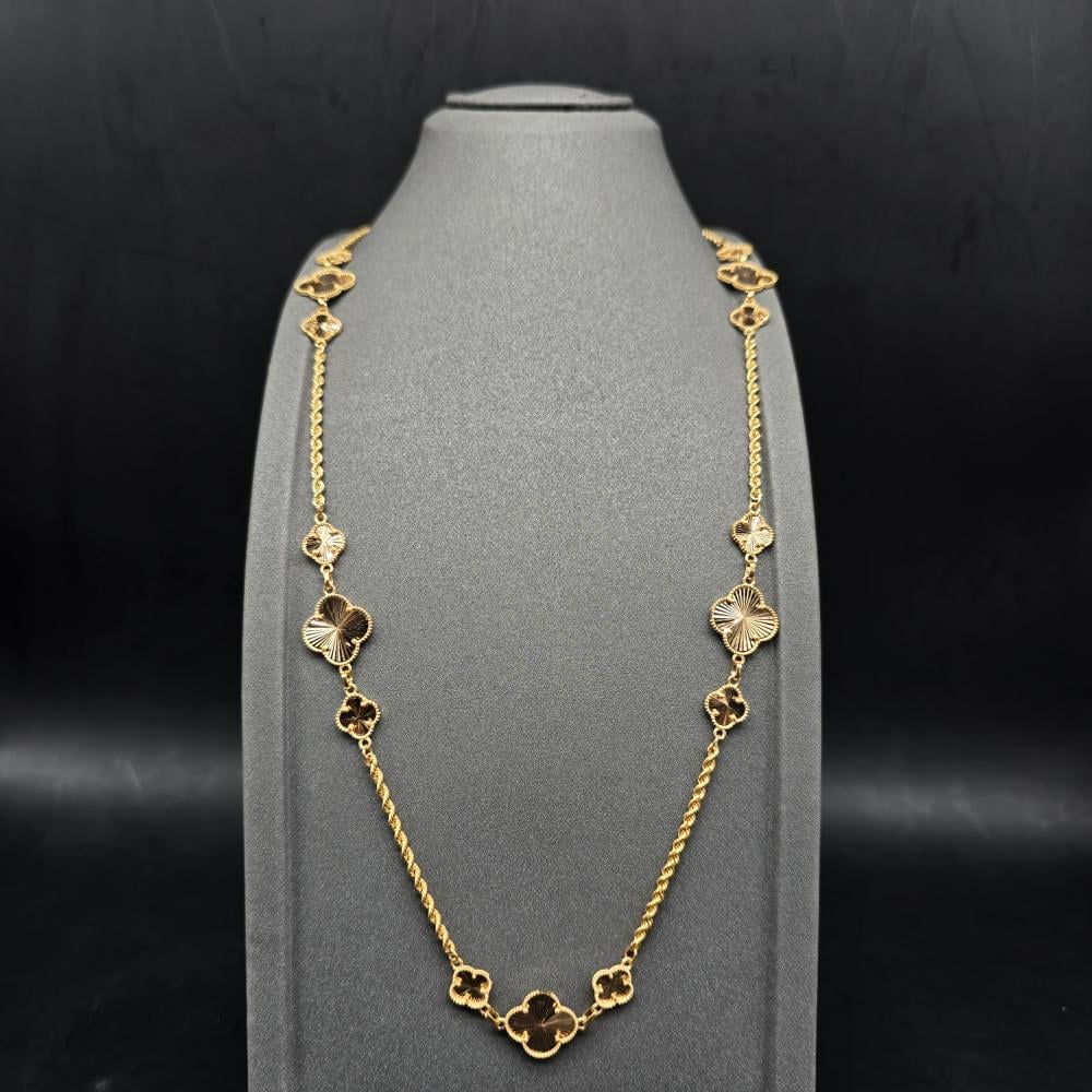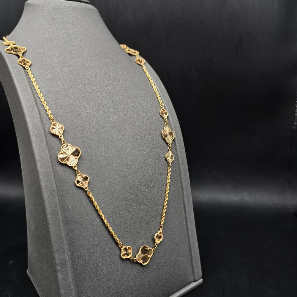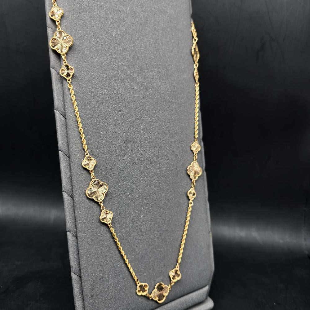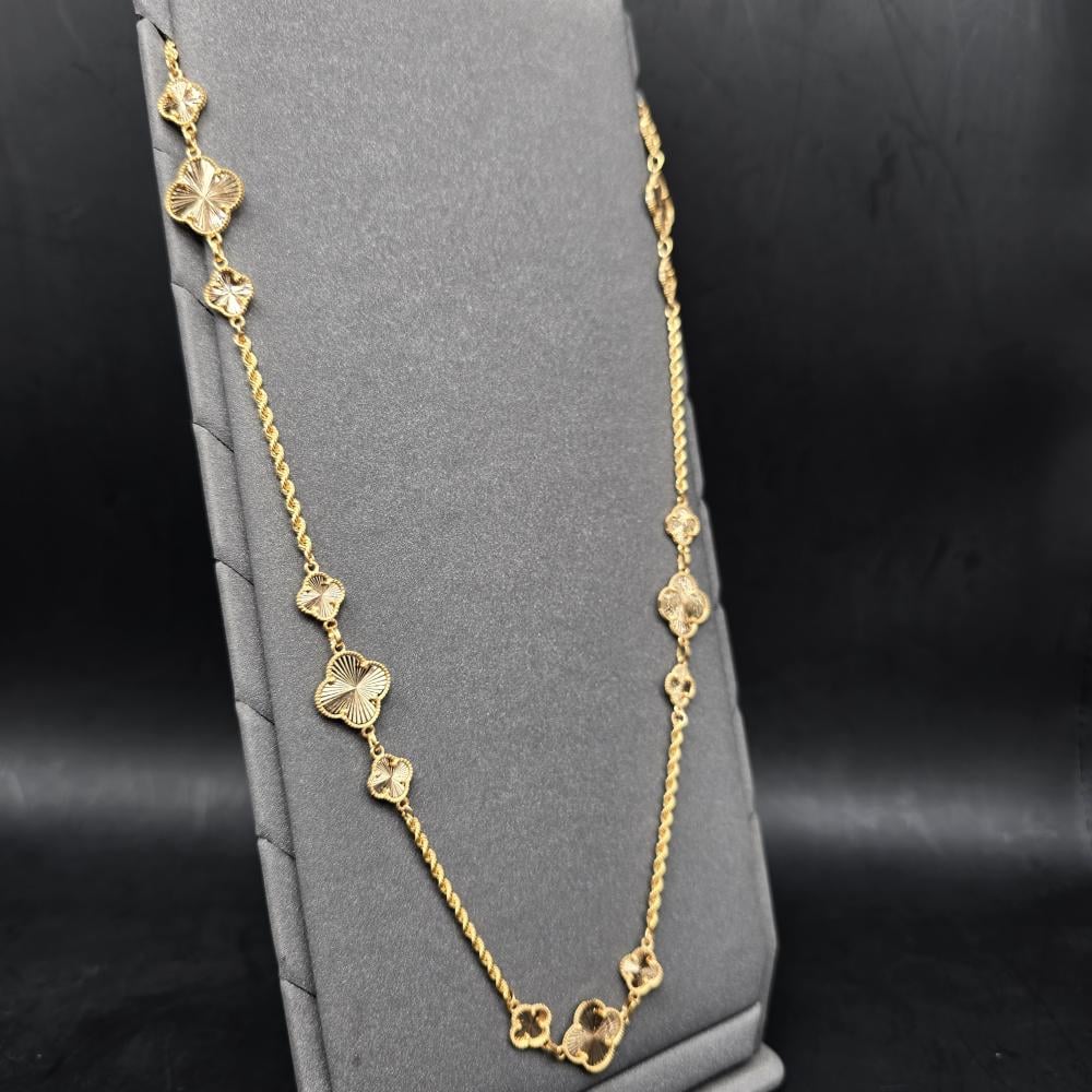 حلي بإطلالة تتسم بالبساطة واتركي إنطباعًا لا يُنسى بارتداء هذه السلسلة الأنيقة من جواهر الكهرمان . تتميز هذه السلسلة بتصميم رقيق مصنوع من ذهب أصفر عيار 21 قيراط ويزينها شكل وردة مكونة من أربع وريقات لإضفاء المزيد من التألق. يمكنكِ ارتداء هذه السلسلة صباحًا ومساءً للتمتع بإطلالة رائعة بدون أي عناء.