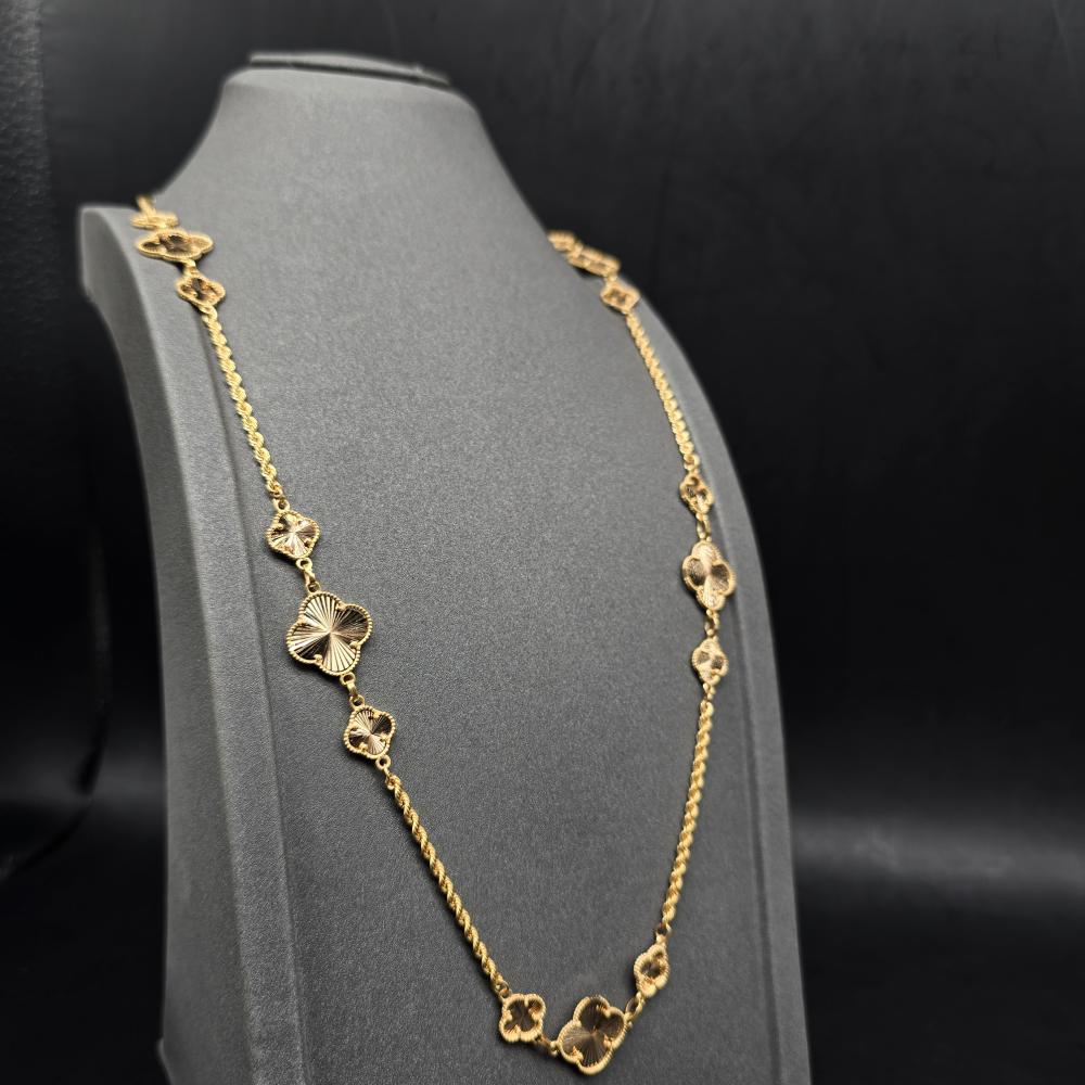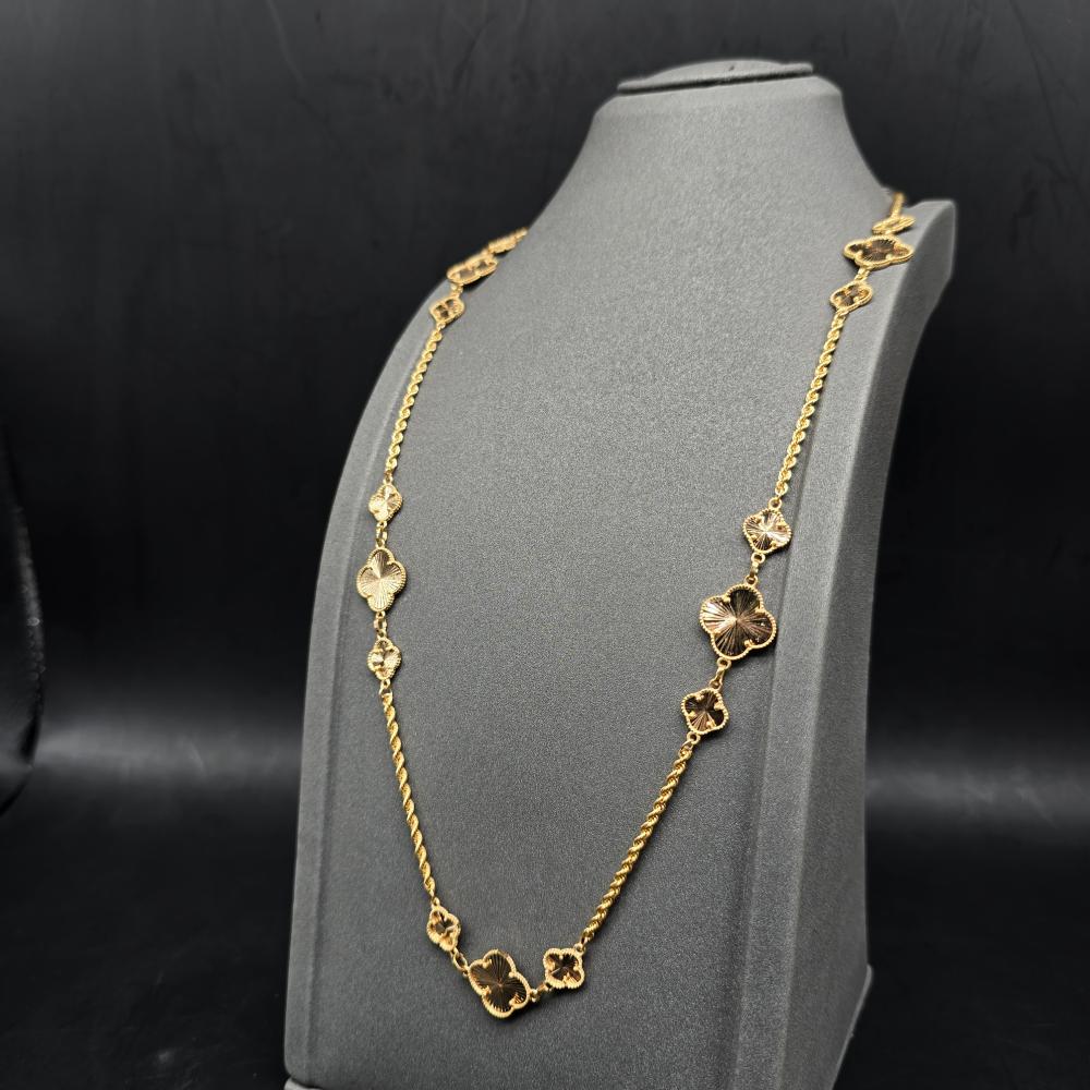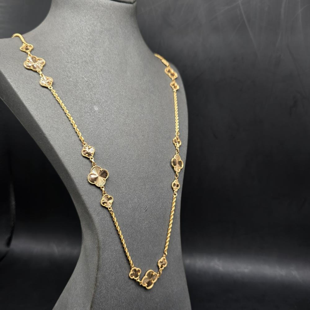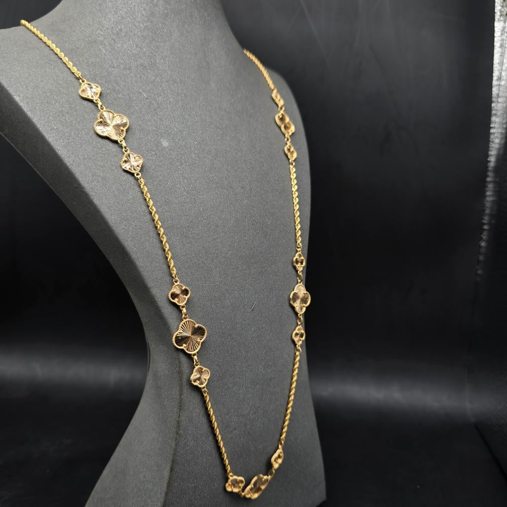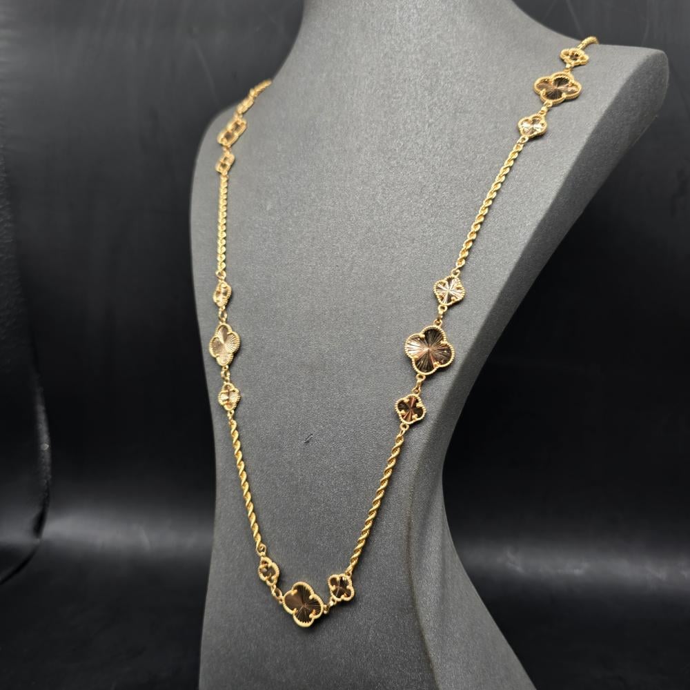 حلي بإطلالة تتسم بالبساطة واتركي إنطباعًا لا يُنسى بارتداء هذه السلسلة الأنيقة من جواهر الكهرمان . تتميز هذه السلسلة بتصميم رقيق مصنوع من ذهب أصفر عيار 21 قيراط ويزينها شكل وردة مكونة من أربع وريقات لإضفاء المزيد من التألق. يمكنكِ ارتداء هذه السلسلة صباحًا ومساءً للتمتع بإطلالة رائعة بدون أي عناء.
