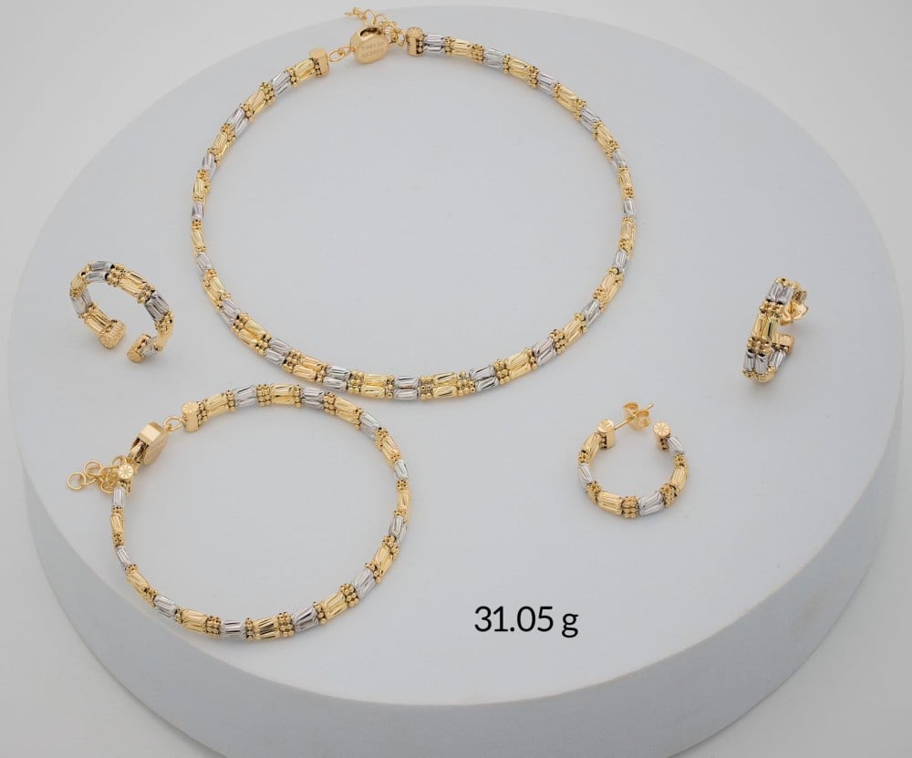 تحلي بإطلالة عصرية مفعمة بالبساطة عند ارتداء هذا الطقم الخلاب من مجموعة ذهب دوريكا الايطالية . يأتي هذا الطقم مصنوع من كرات الذهب عيار 18 قيراط ويحتوي على سلسلة خرزية الشكل وخاتم وأسورة وأقراط . يعتبر هذا الطقم بمثابة الإضافة المثالية لمظهركِ الصباحي والمسائي .