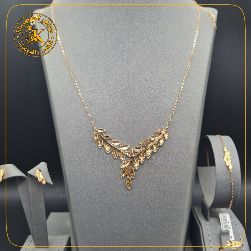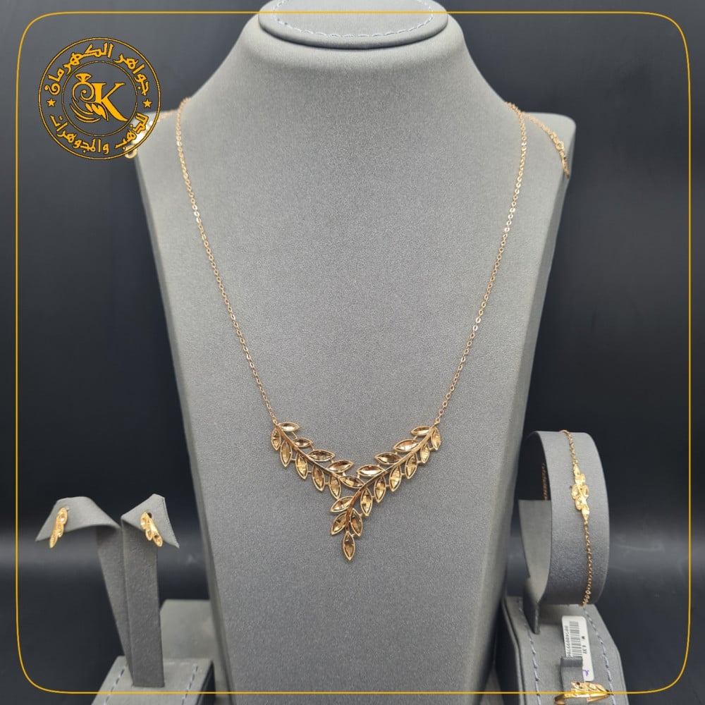 اجلبى حظك بيدك مع هذا الطقم بنقش غصن الزيتون المميز من جواهر الكهرمان . إنه تصميم رائع من الذهب الأصفر عيار 21 قيراطًا ولمعانًا لا يصدق ، مما يجعله اختيارًا مناسبًا للمناسبات اليومية. ضافة فاتنة تلائم بهائك ولكن إحذرى، لن تتوقف العيون عن الإلتفاف حولك.