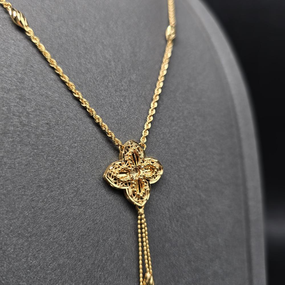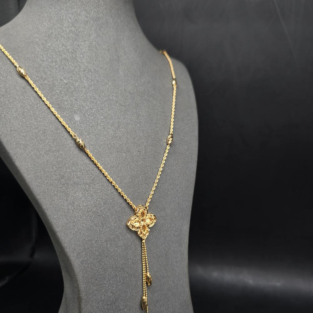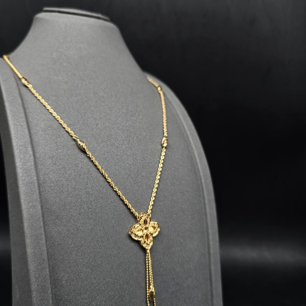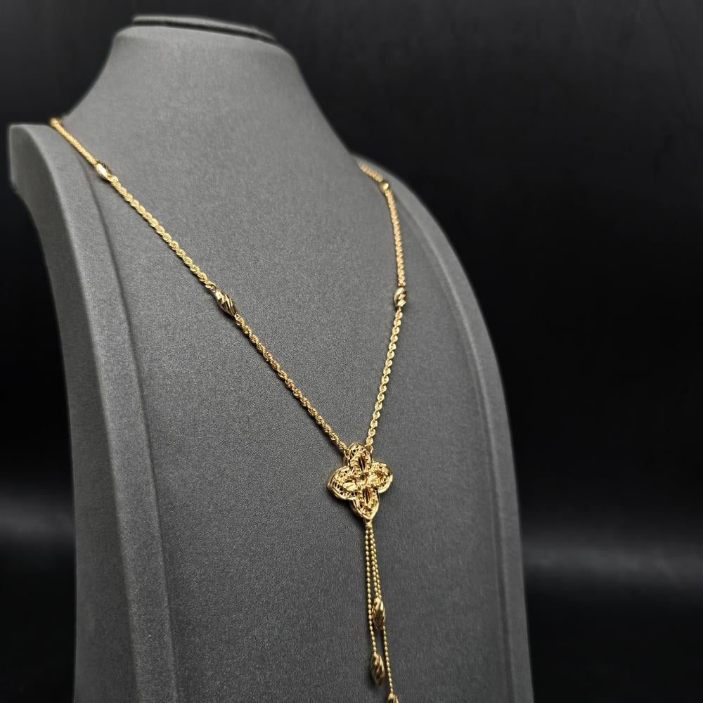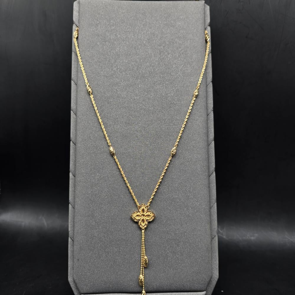 حلي بإطلالة تتسم بالبساطة واتركي إنطباعًا لا يُنسى بارتداء هذه السلسلة الأنيقة من جواهر الكهرمان . تتميز هذه السلسلة بتصميم رقيق مصنوع من ذهب أصفر عيار 21 قيراط ويزينها شكل وردة مكونة من أربع وريقات لإضفاء المزيد من التألق. يمكنكِ ارتداء هذه السلسلة صباحًا ومساءً للتمتع بإطلالة رائعة بدون أي عناء.
