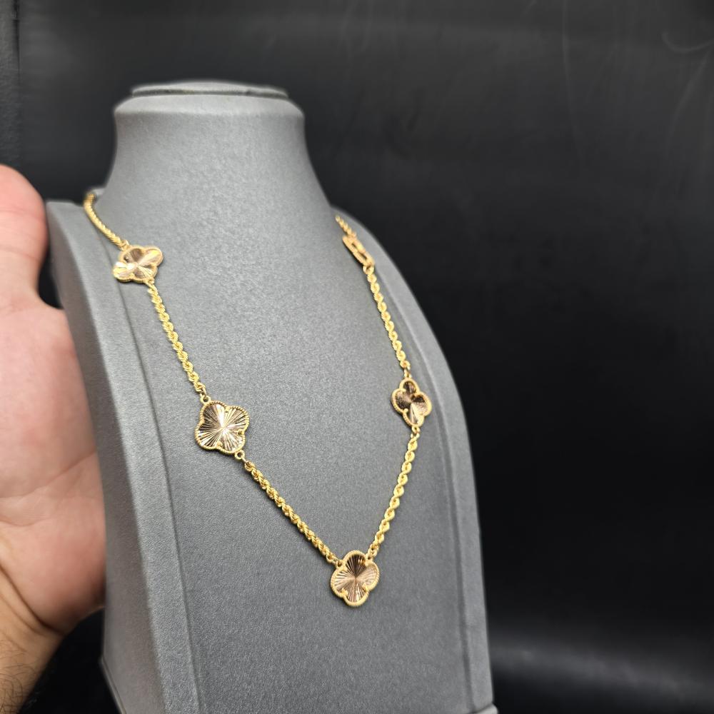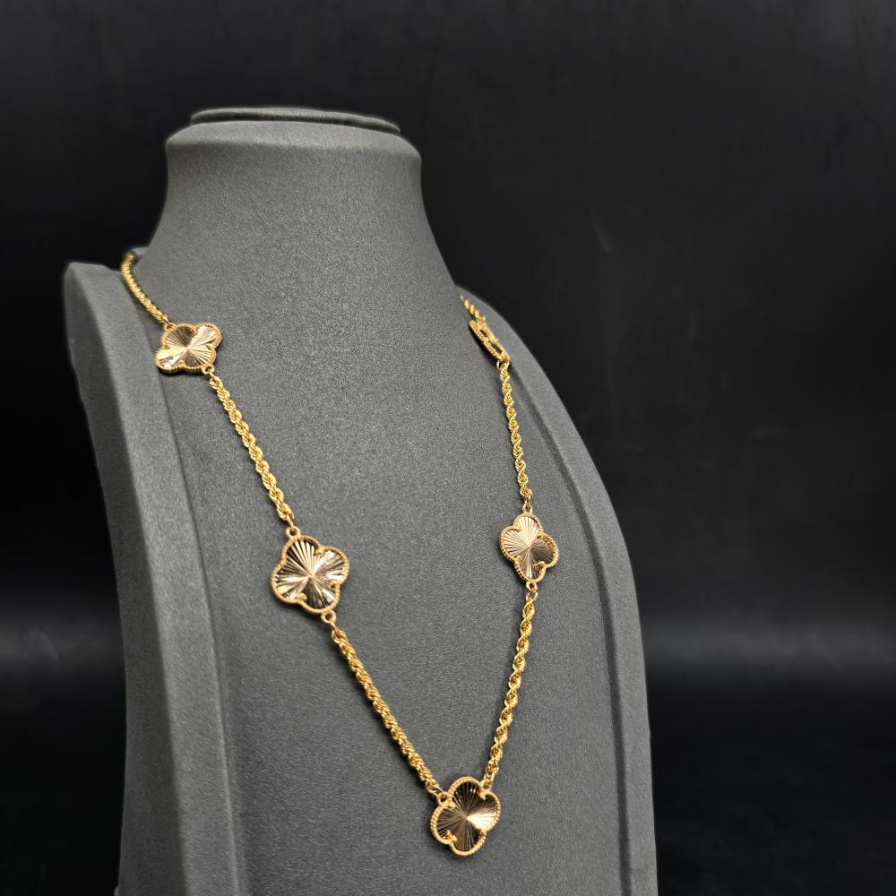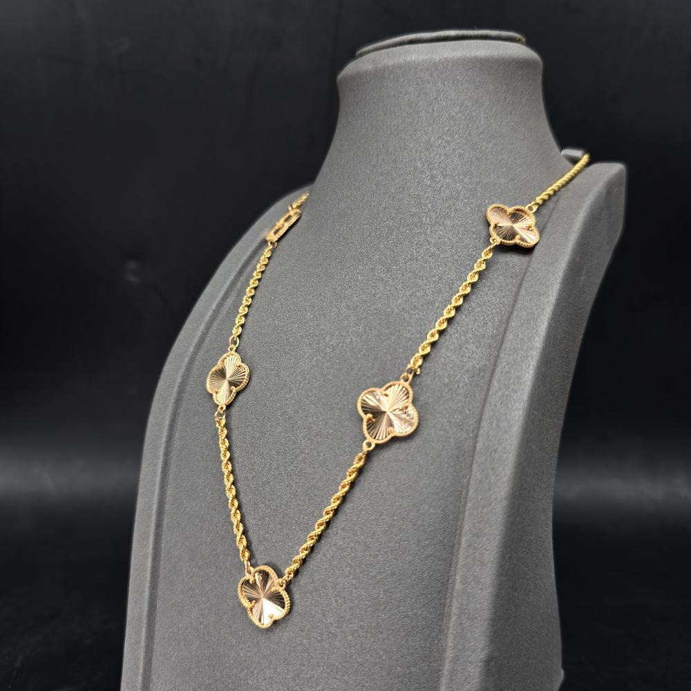 حلي بإطلالة تتسم بالبساطة واتركي إنطباعًا لا يُنسى بارتداء هذه السلسلة الأنيقة من جواهر الكهرمان . تتميز هذه السلسلة بتصميم رقيق مصنوع من ذهب أصفر عيار 21 قيراط ويزينها شكل وردة مكونة من أربع وريقات لإضفاء المزيد من التألق. يمكنكِ ارتداء هذه السلسلة صباحًا ومساءً للتمتع بإطلالة رائعة بدون أي عناء.