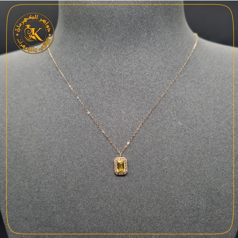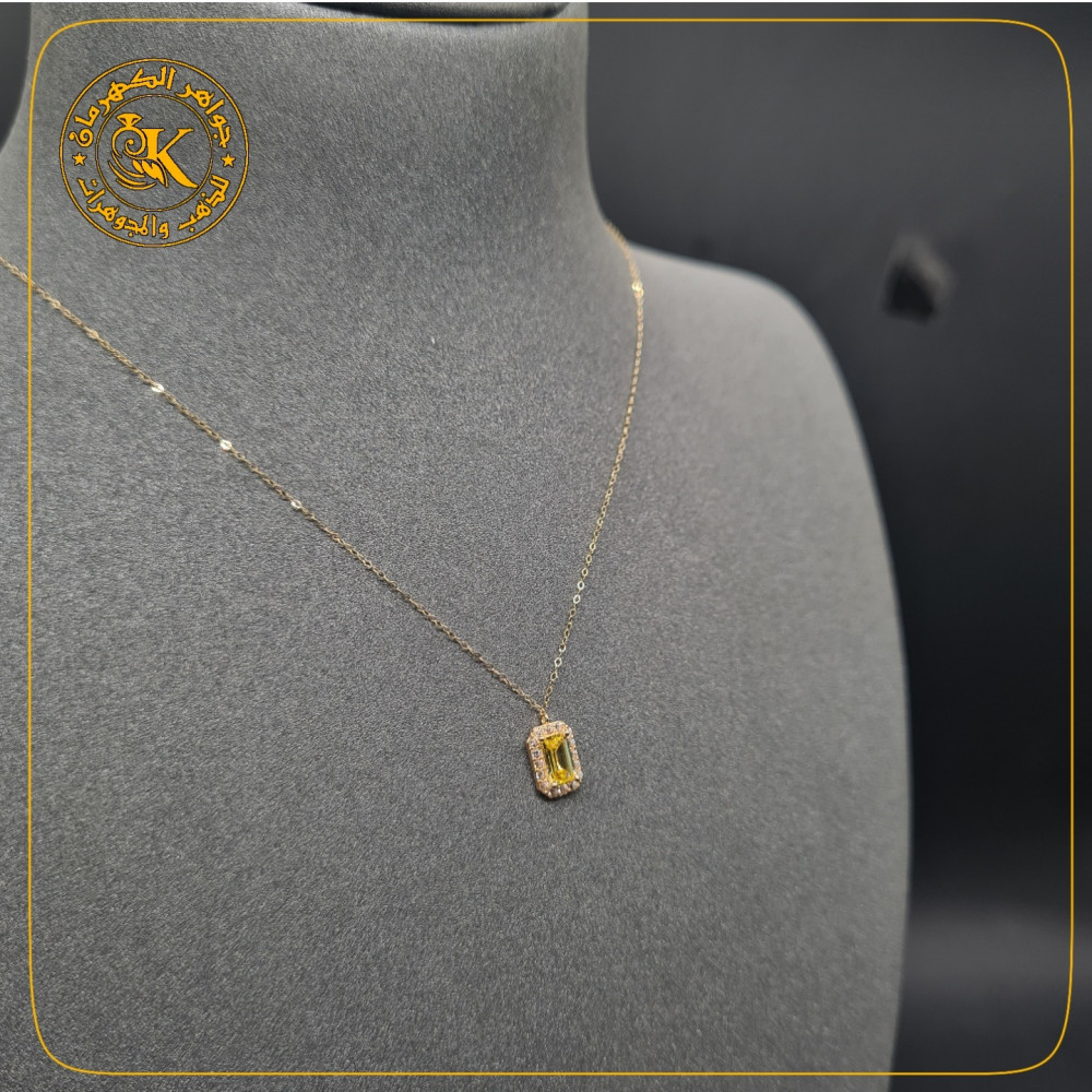 كوني متألقة أينما تذهبين بارتداء هذه السلسلة بدلاية الفانسي من جواهر الكهرمان . تأتي السلسلة في تصميم يجمع بين الفخامة والتكلفة المناسبة، حيث أنها مصنوعة من ذهب اصفر عيار 18 قيراط ومزينة بدلاية شكل الايميرالد الفانسي . تعتبر هذه السلسلة بمثابة الإضافة العصرية لإطلالتك كما يمكنكِ ارتدائها مع أقراط صغيرة.